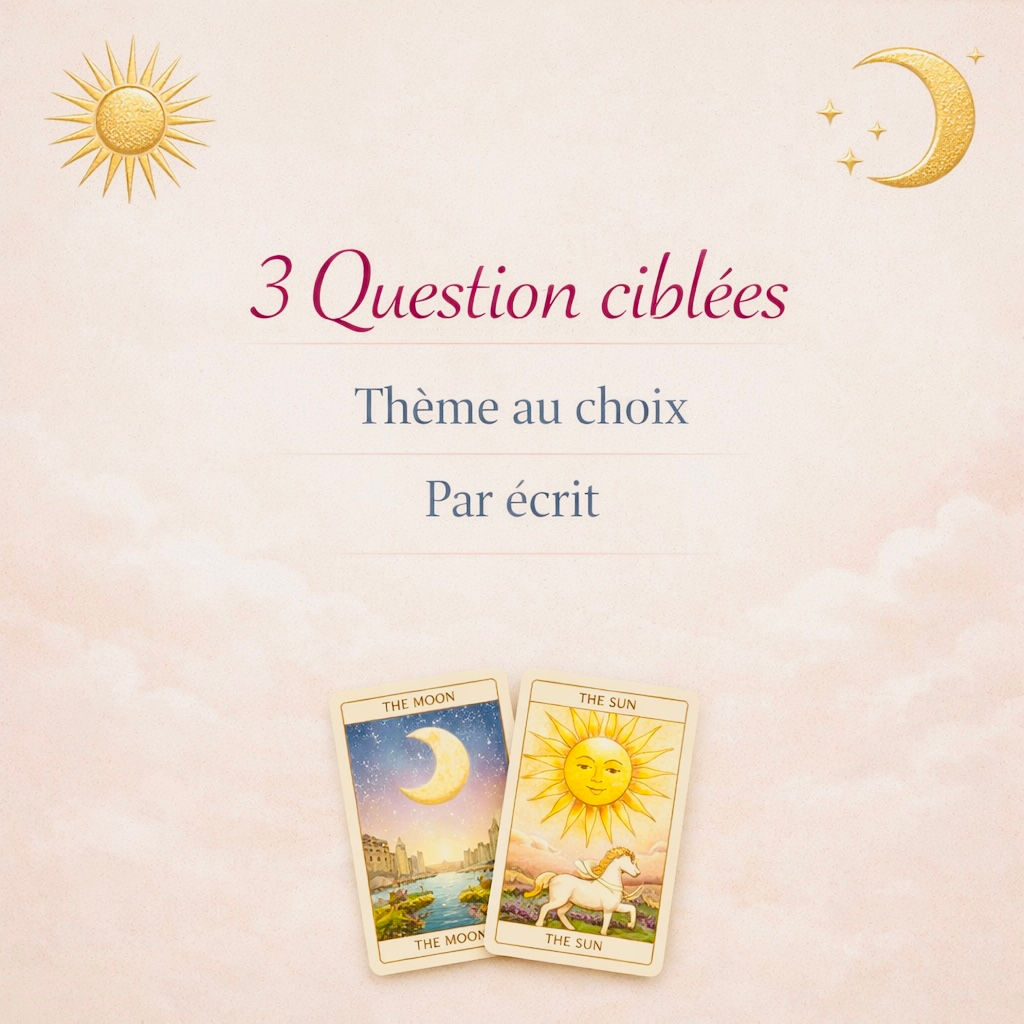 Choisissez la formule souhaitée (1, 2 ou 3 questions), puis validez votre commande sur le site. Après réservation, envoyez votre question accompagnée de votre prénom et de votre date de naissance. Si une autre personne est concernée, vous pouvez aussi préciser ses informations.
